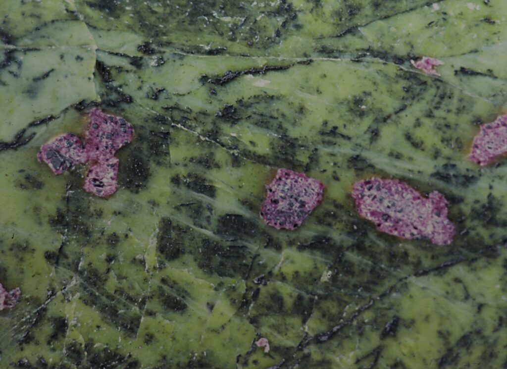 Stichtite in serpentine group mineral, probably including antigorite, Stichtite Hill, Tasmania. Keith Lancaster slide. Scale unknown.