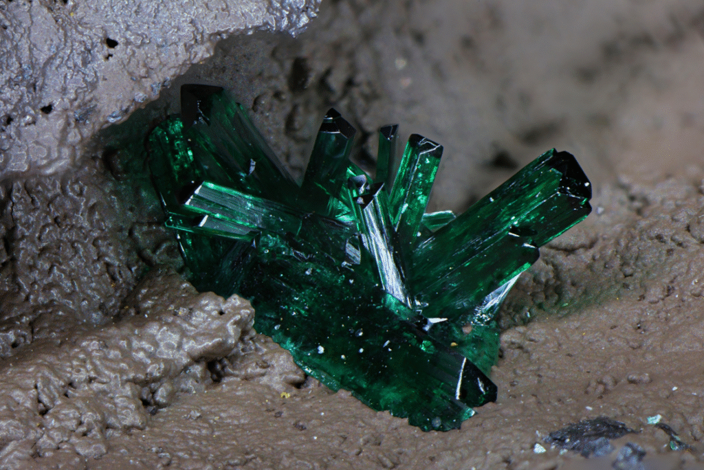 Atacamite is an uncommon mineral that occurs primarily in copper deposits in arid zones. It commonly occurs as slender prismatic green crystals that can look almost black from some angles, particularly the terminations, or as nodules. Early specimens from Moonta-Wallaroo and Kadina are arguably the best in the world.
